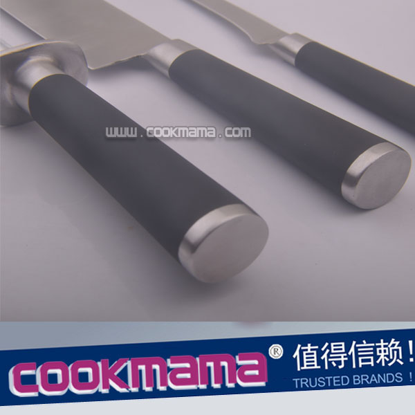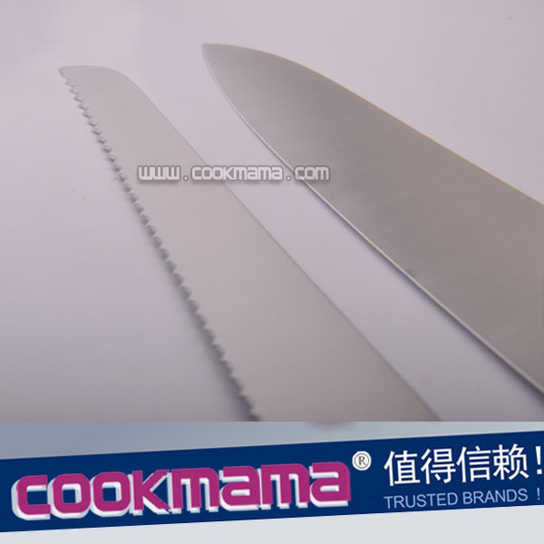 9" chef's knife 9" meat cleaver 8.5" bread knife 10" ham knife 7" chopper 6" bonning knife 9”meat fork 3.5" paring knife 9" sharpener Thickness:3/1.5mm Surface treatment:fine matt finished |